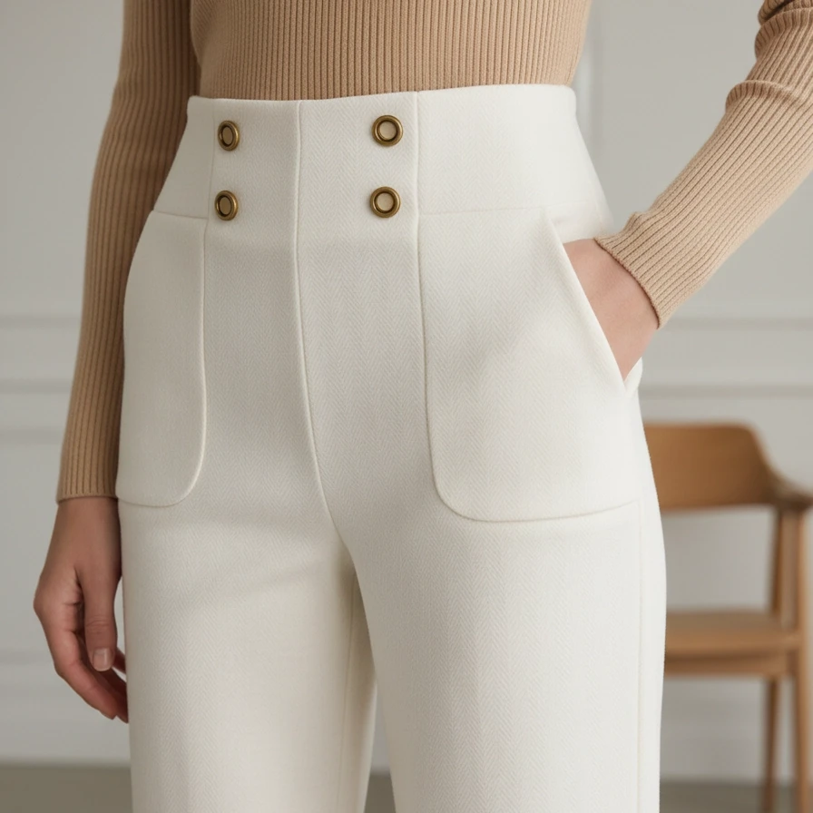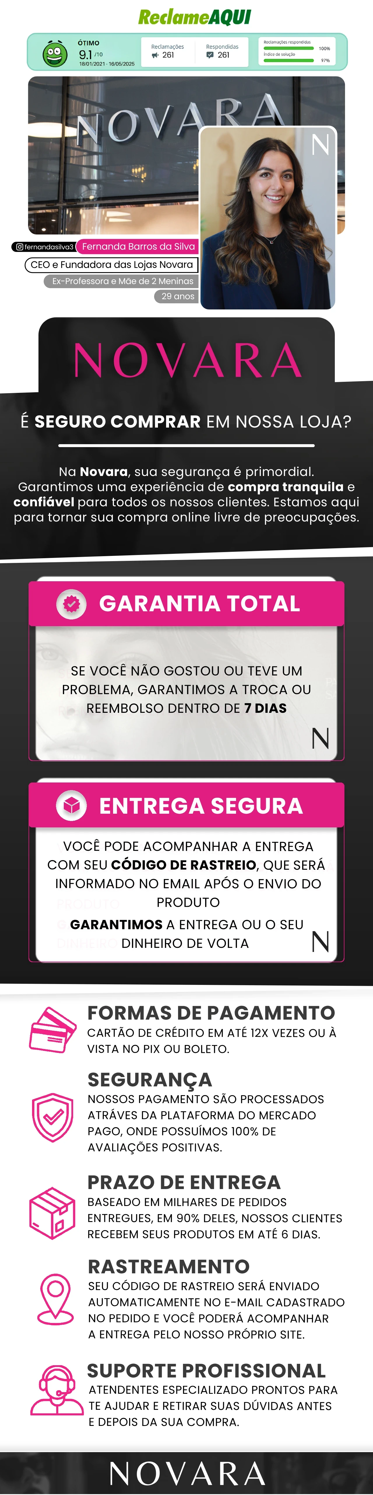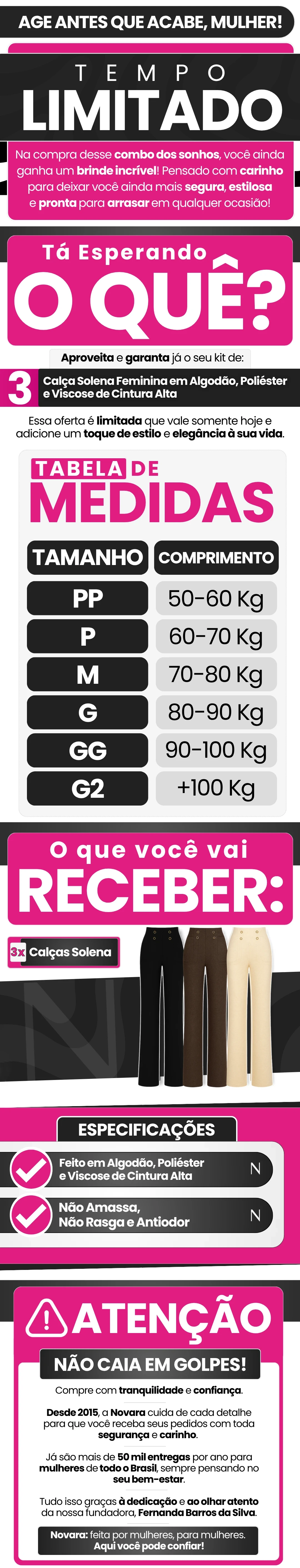 Cintura alta que abraça e afina, pernas largas para um caimento impecável, nada apertando, nada marcando. Ela simplesmente se encaixa em você, seja qual for seu corpo. Vista, se olhe no espelho e sinta orgulho de estar linda, arrumada e poderosa. Sem esforço, sem sacrifício. Se permita viver essa sensação todos os dias!